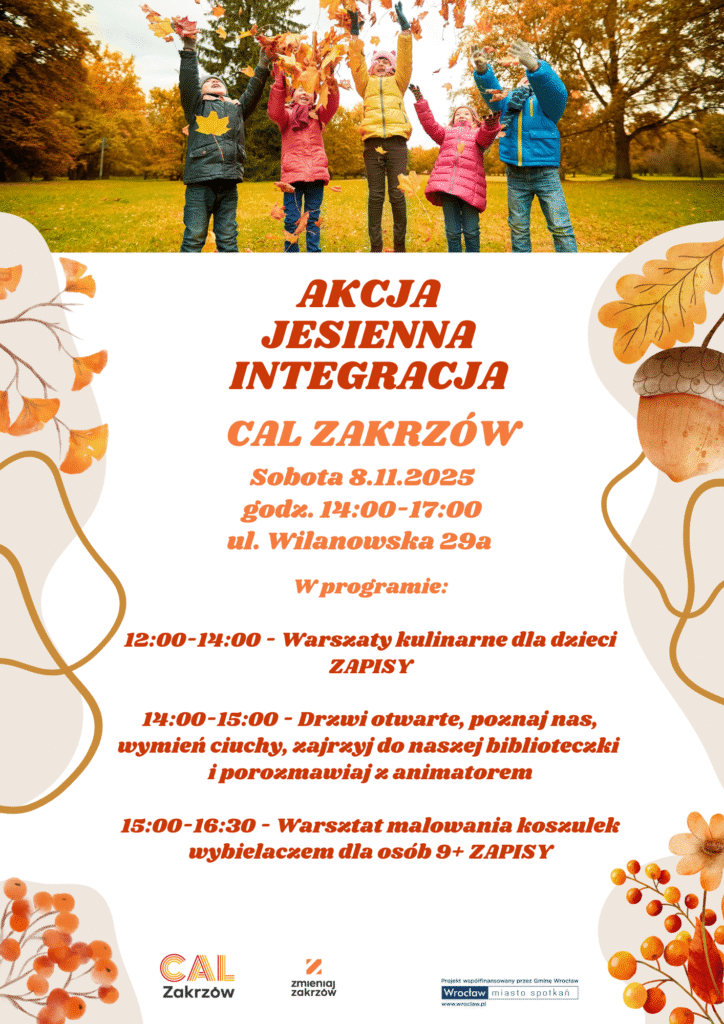 [Grafika: dzieci rzucające liście w parku w jesiennych kolorach, poniżej: AKCJA JESIENNA INTEGRACJA, CAL ZAKRZÓW, Sobota 8.11.2025, godz. 14:00-17:00, ul. Wilanowska 29a, W programie:, 12:00-14:00 – Warsztaty kulinarne dla dzieci ZAPISY, 14:00-15:00 – Drzwi otwarte, poznaj nas, wymień ciuchy, zajrzyj do naszej biblioteczki i porozmawiaj z animatorem, 15:00-16:30 – Warsztat malowania koszulek wybielaczem dla osób 9+ ZAPISY]