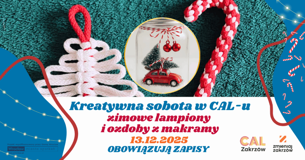 [Grafika: świąteczne ozdoby na zielonym tle, poniżej napis: Kreatywna sobota w CAL-u, zimowe lampiony i ozdoby z makramy, 13.12.2025, obowiązują zapisy]