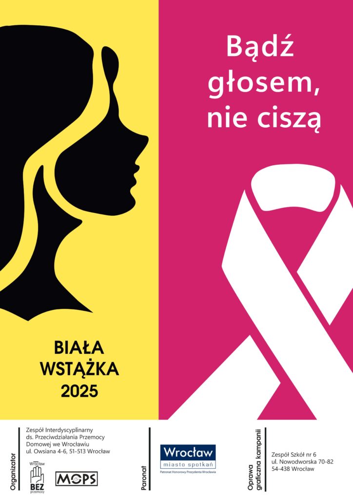 [Grafika: czarna postać kobiety na żółtym tle i napis „Biała Wstążka 2025″, biała wstążka na różowym tle z napisem ” Bądź głosem, nie ciszą”]