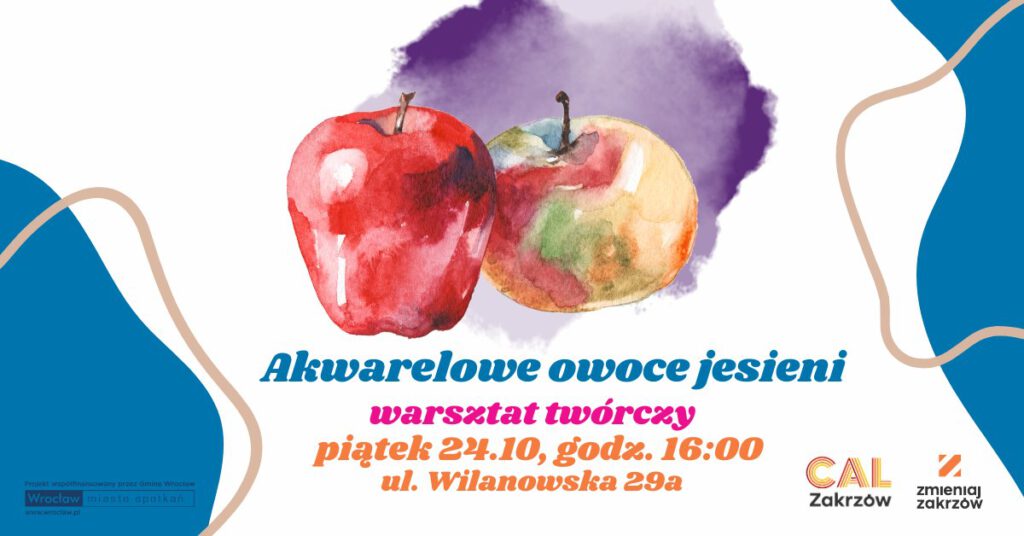 [Grafika: w tle jabłka namalowane farbami wodnymi, pod spodem napis: warsztat twórczy, piątek 24.10, godz. 16:00, ul. Wilanowska 29a]