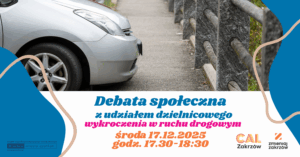 Komisariat Policji Wrocław Osiedle z ul. Kiełczowskiej zaprasza do CAL-u na spotkanie w formie debaty społecznej. Tematem będą szczególnie uciążliwe wykroczenia w ruchu drogowym. Można przyjść ze zgłoszeniem, ugruntować wiedzę na temat obowiązujących przepisów, wskazać problemy występujące w okolicy. Debatę przeprowadzą policjanci, na miejscu będzie obecny dzielnicowy z naszego rejonu. 📅 Środa: 17.12, godz. 17:30–18:30 … Czytaj dalej Debata społeczna w CAL-u