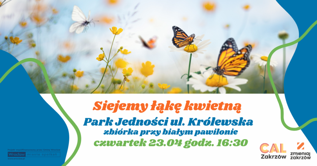 [Grafika: Zdjęcie motyli zasiadających na kwiatach łąkowych, pod spodem napis: „Siejemy łąkę kwietną. Park Jedności ul. Królewska – zbiórka przy białym pawilonie, czwartek 23.04 godz. 16:30]