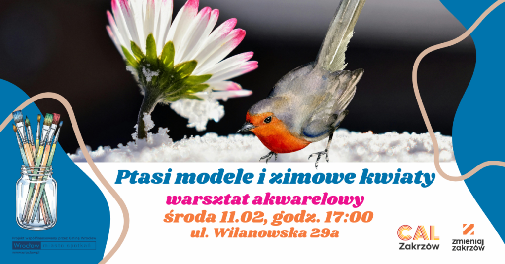[Grafika: pomarańczowo-szary ptaszek przyczajony na śniegu, w tle ośnieżona stokrotka, pod spodem napis: „Ptasi modele i zimowe kwiaty – warsztat akwarelowy, środa 11.02, godz. 17:00, ul. Wilanowska 29a”]