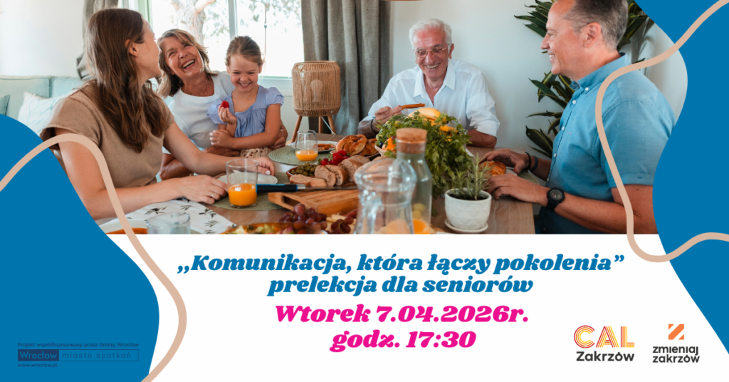 [Grafika: rodzina przy stole, napis: ,,Komunikacja, która łączy pokolenia”, prelekcja dla seniorów, wtorek 7 kwietnia 2026r., godz. 17:30, CAL Zakrzów]