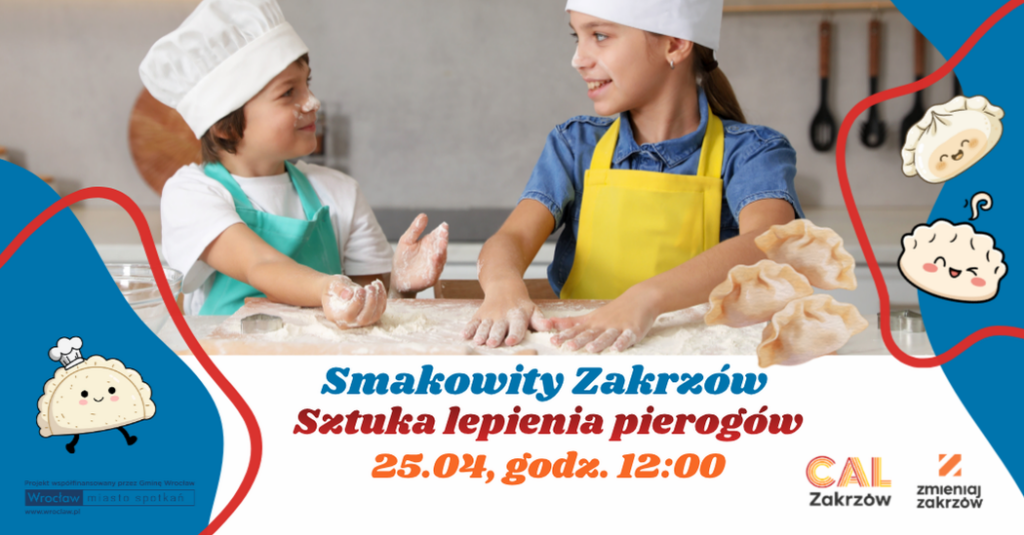[Grafika: dzieci lepią pierogi, poniżej napis: „Smakowity Zakrzów – Sztuka lepienia pierogów, 25.04.2026 – godz. 12.00”]