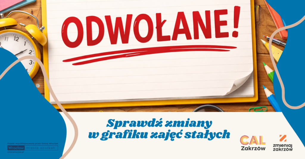 [Grafika: kartka z napisem ODWOŁANE, poniżej napis: „Sprawdź zmiany w grafiku zajęć stałych”]