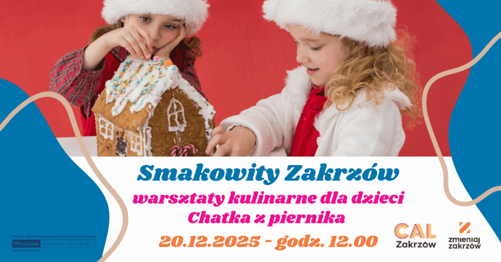 [Grafika: dwoje dzieci w czapkach świątecznych dekoruje piernikową chatkę, poniżej napis: Smakowity Zakrzów, warsztaty kulinarne dla dzieci, Chatka z piernika, 20.12.2025, godz. 12.00, CAL Zakrzów]