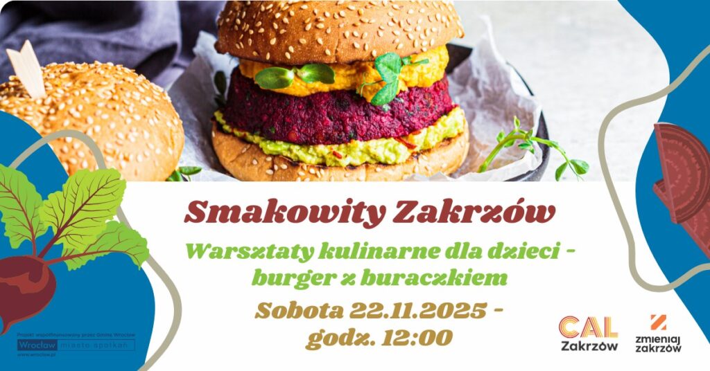 [Grafika: burger z sosami, poniżej napis: Smakowity Zakrzów, Warsztaty kulinarne dla dzieci – burger z buraczkiem, Sobota 22.11.2025 – godz. 12.00, po bokach rysunki buraka dla ozdoby]