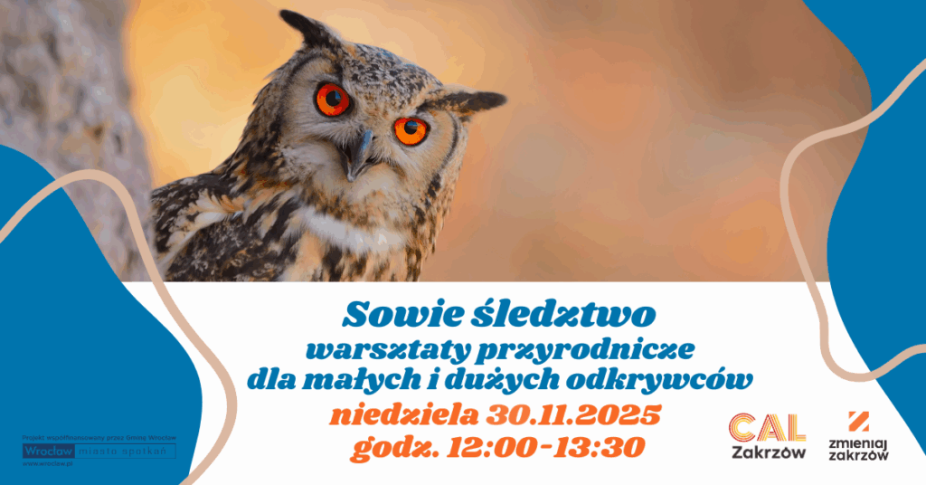 [Grafika: zdjęcie sowy wyglądającej zza drzewa, pod spodem napis: „Sowie śledztwo – warsztaty przyrodnicze dla małych i dużych odkrywców, niedziela 30.11.2025, godz. 12:00-13:30]