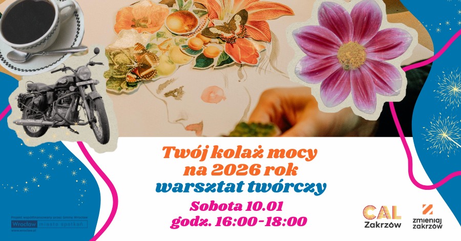[Grafika: kolorowy kolaż w trakcie robienia, pod spodem napis: „Twój kolaż mocy na 2026 rok – warsztat twórczy, sobota 10.01, godz. 16:00-18:00]