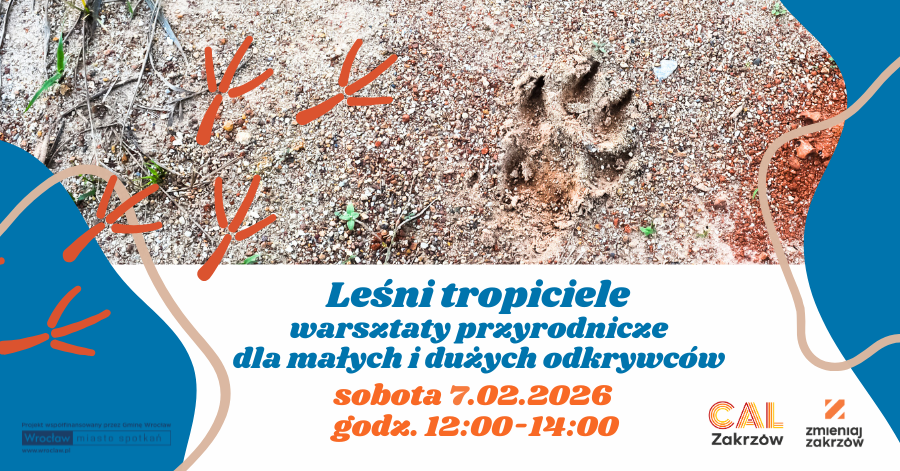 [Grafika: ślad pozostawiony przez pewne zwierzę na ziemi, pod spodem napis: „Leśni tropiciele – warsztaty przyrodnicze dla małych i dużych odkrywców, sobota 7.02