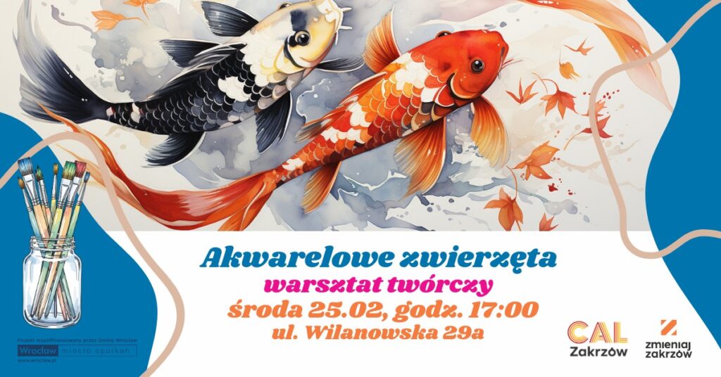 [Grafika: kolorowe ryby namalowane akwarelą, pod spodem napis: Akwarelowe zwierzęta – warsztat twórczy, środa 25.02, godz. 17:00, ul. Wilanowska 29a]