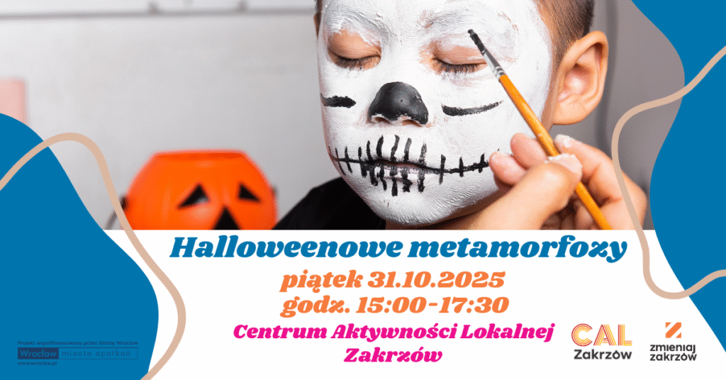 [Grafika: dziecko z pomalowaną buzią w halloweenowym wzorze, poniżej: Halloweenowe metamorfozy, piątek 31.10, godz. 15:00–17:30, Centrum Aktywności Lokalnej Zakrzów]