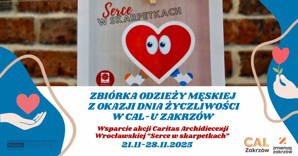 [Zdjęcia: serduszko na tle ceglanej ściany, podpisane „Serce w skarpetkach”, poniżej napis „Zbiórka odzieży męskiej z okazji Dnia Życzliwości w CAL-u Zakrzów”, „Wsparcie akcji Caritas Archidiecezji Wrocławskiej „Serce w skarpetkach”, „21.11-28.11.2025]